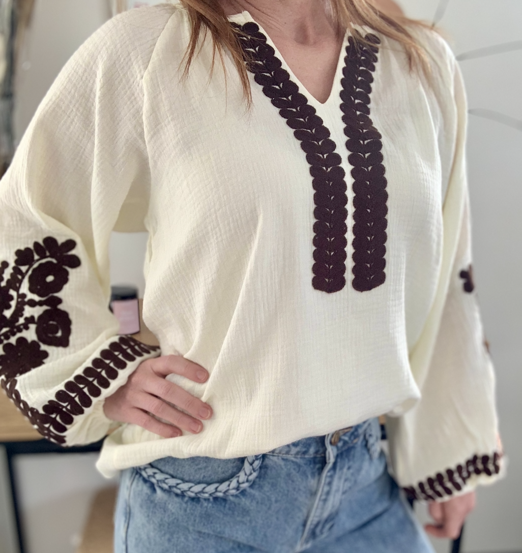 Blouse brodée en gaze de coton au style bohème chic. La blouse Anouk apporte caractère et élégance naturelle à vos tenues du quotidien.