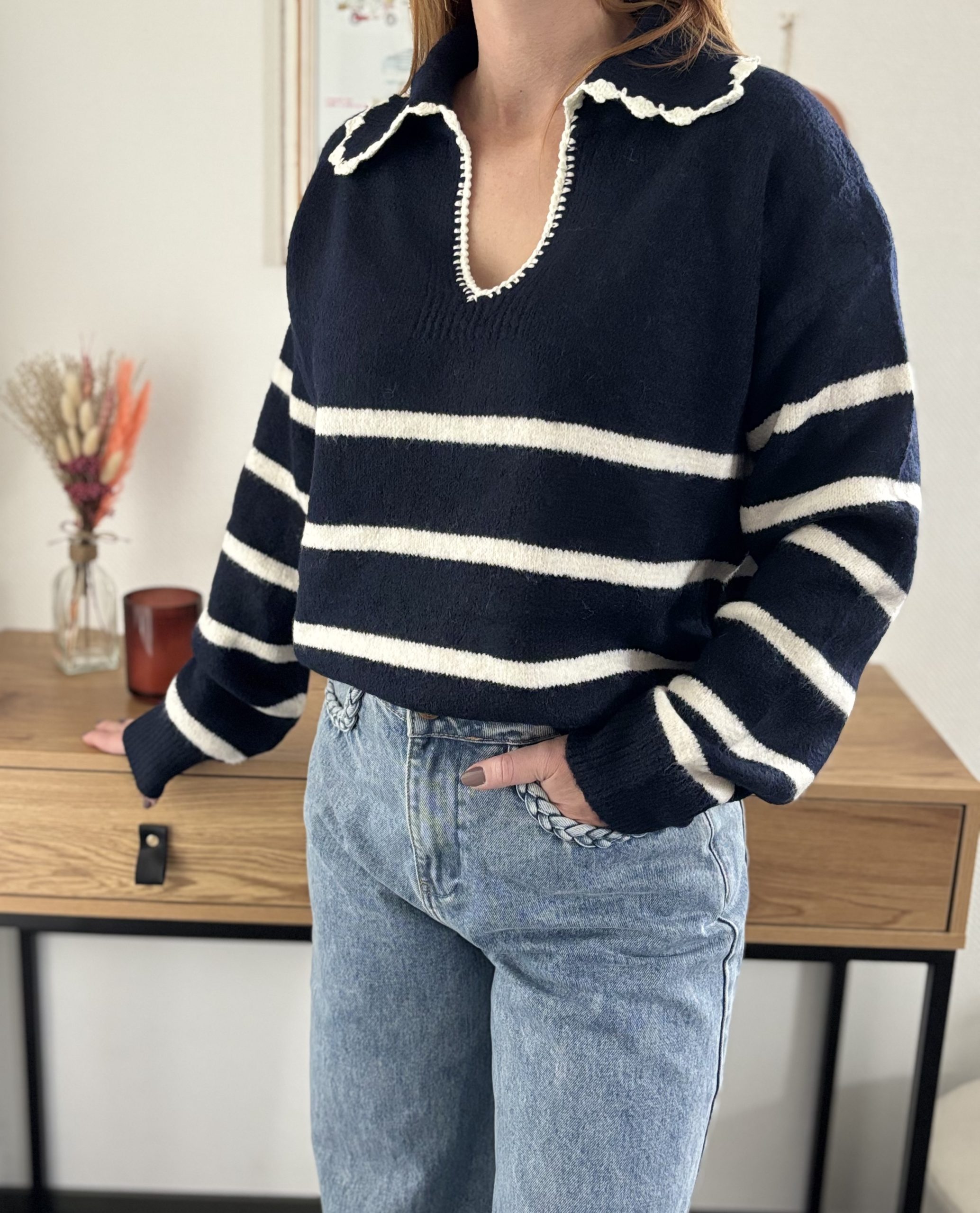Le pull Alizée revisite la marinière avec douceur et féminité. Son bleu marine intense contraste délicatement avec les rayures écrues, dans un esprit intemporel et élégant.